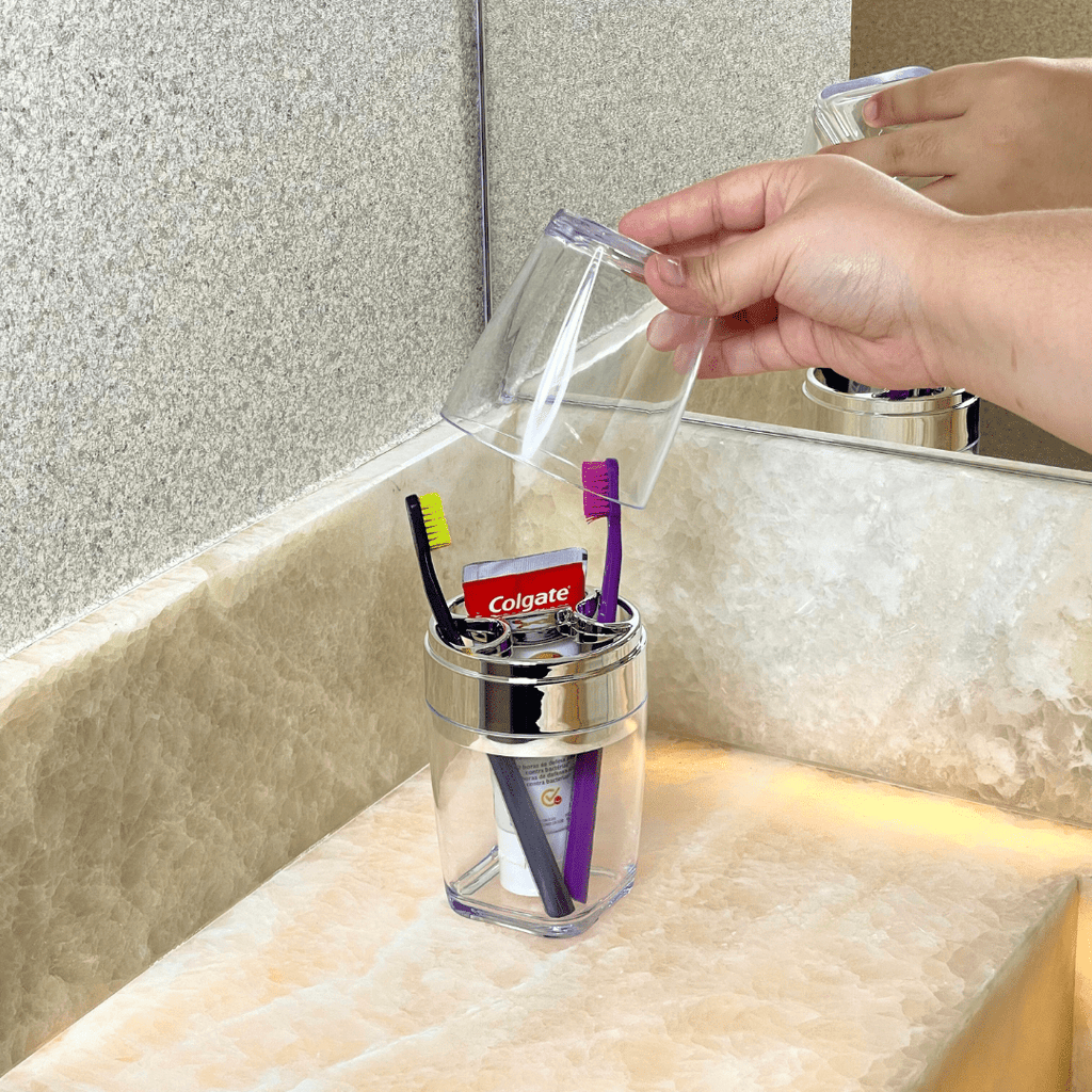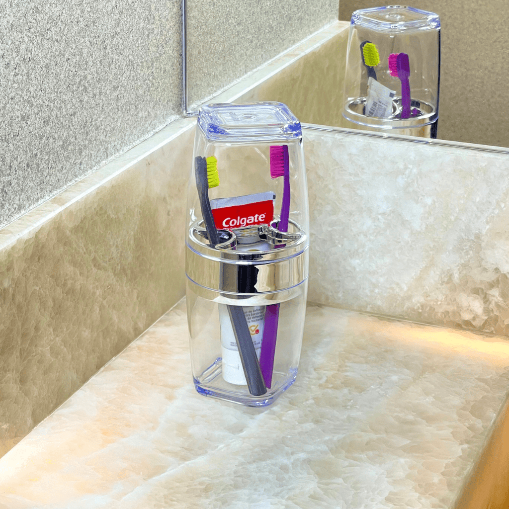 - No armário ou na pia do banheiro, o suporte para escova de dentes é ideal para manter os itens de higiene separados, protegidos e organizados.