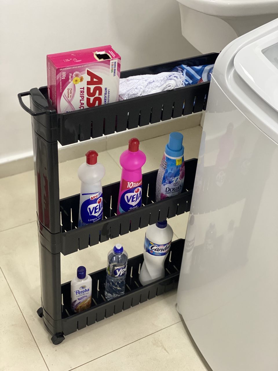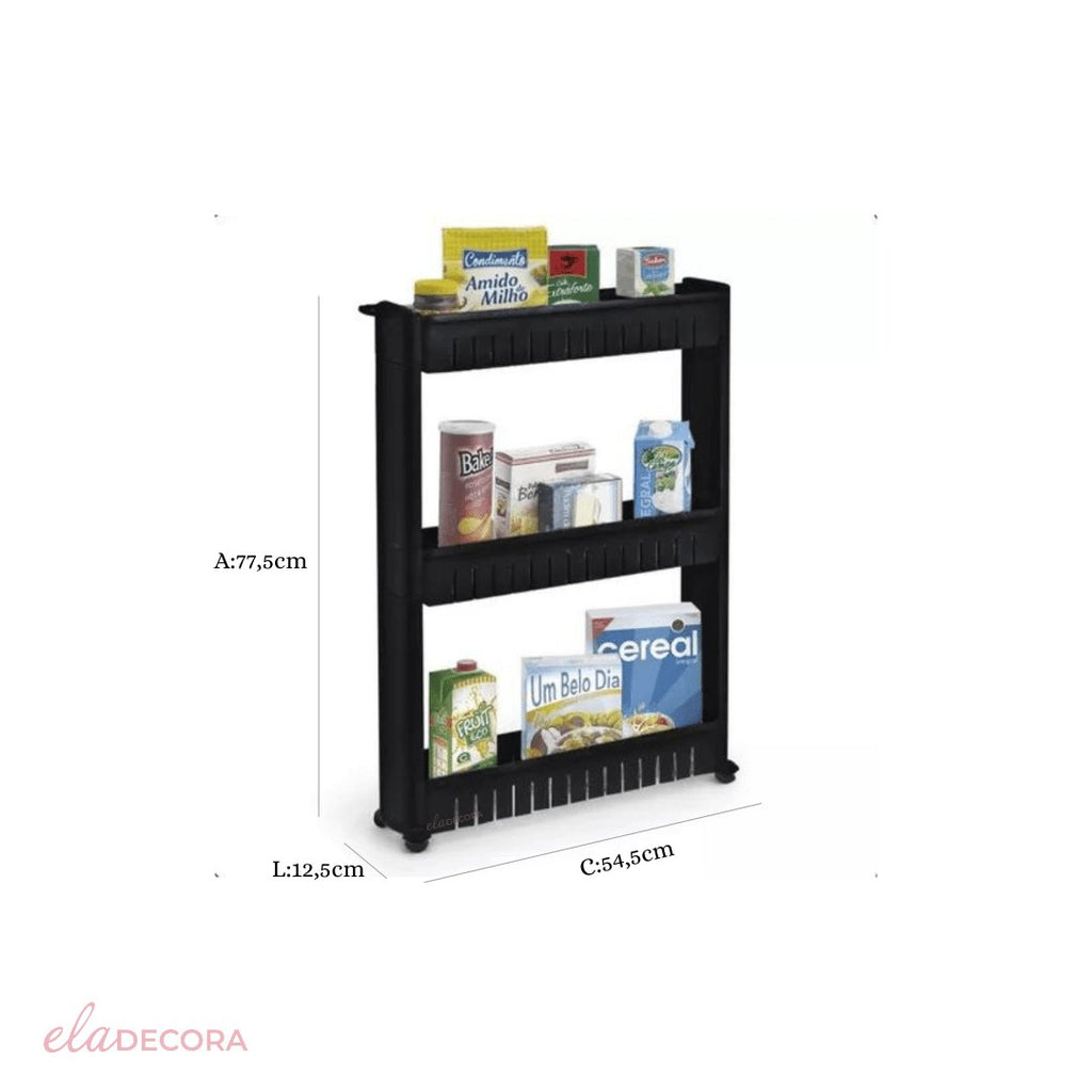 • Possui 3 prateleiras e design compacto, permitindo que você organize produtos e utilize espaços antes de inutilizados;